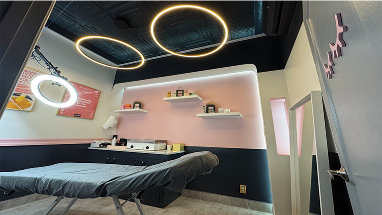 The spa features an inviting reception area with cozy seating, a curated product wall that generates additional revenue and seven beautiful treatment rooms. The treatment rooms are as follows: 2 fully equipped facial rooms, a waxing suite, a laser hair removal room, a body contouring treatment room, a luxurious spa room with shower, an empty treatment room an office space and a storage room. Additional space includes a semi-private room for lash extension services and two beds for teeth whitening. Space also includes a restroom and employee cleaning station.
